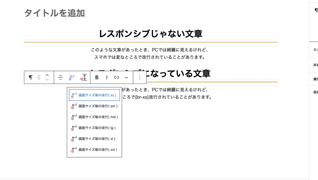 改行したい場所に、指定のサイズの改行ボタンを入れると、そのサイズのデバイスのみ改行されるという仕組みです!